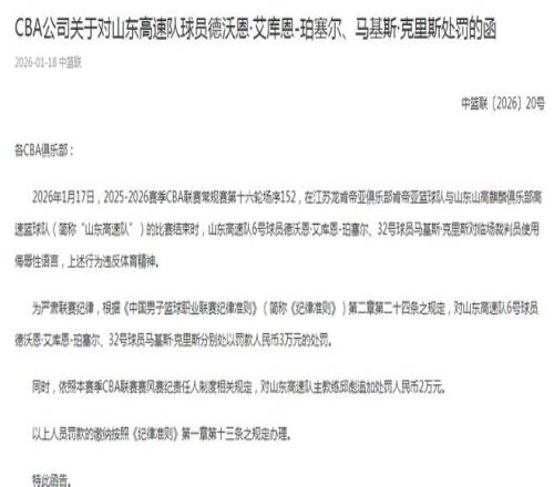 CBA官方罚单具体如下: 各CBA俱乐部: 2026年1月17日,2025-2026赛季CBA联赛常规赛第十六轮场序152,在江苏龙肯帝亚俱乐部肯帝亚篮球队与山东山高麒麟俱乐部高速篮球队(简称“山东高速队”)的比赛结束时,山东高速队6号球员德沃恩·艾库恩-珀塞尔、32号球员马基斯·克里斯对临场裁判员使用侮辱性语言,上述行为违反体育精神。 为严肃联赛纪律,根据《中国男子篮球职业联赛纪律准则》(简称《纪律准则》)第二章第二十四条之规定,对山东高速队6号球员德沃恩·艾库恩-珀塞尔、32号球员马基斯·克里斯分别处以罚款人民币3万元的处罚。