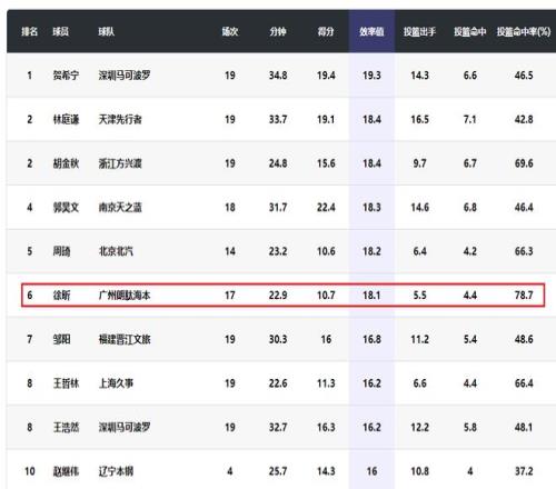 徐昕的效率值达到了18.1,在国内本土球员中排名第六,在他前面的是贺希宁、胡金秋、林庭谦、郭昊文和周琦。徐昕的投篮命中率在本赛季场均得到4分以上的球员中排名第一。徐昕场均得到7.3个篮板,在本赛季本土球员中排名第二,仅次于场均得到9.1个篮板的周琦。 作为对比,从广州男篮来到广东宏远男篮的焦泊乔在本赛季场均得到5.0分3.7篮板0.4助攻0.3抢断0.5盖帽,投篮命中率55%,三分命中率0%,罚球命中率72.5%。很显然,徐昕无论在进攻还是在防守端都比焦泊乔出色。
