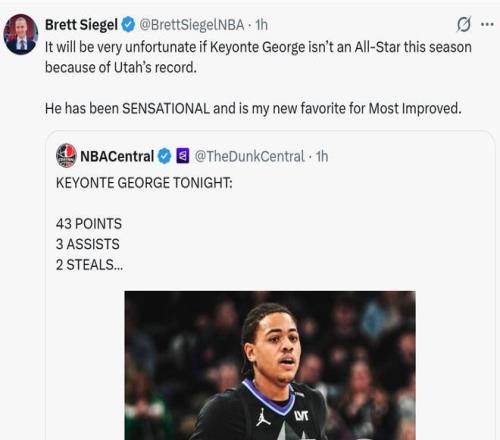 乔治生涯之夜 爵士队之所以能够完成爆冷,新星乔治的表现至关重要,本场22岁的基昂特乔治打出生涯之夜。 全场28中15,三分13中6,爆砍生涯新高的43分,外加3助2断,率队爆冷拿下胜利。 面对乔治这样的表现,名记Brett Siegel不禁感叹:“如果乔治因为战绩影响没能入选全明星那真的让人感到遗憾,本赛季他交出惊艳表现,是我心中进步最快球员人选。”