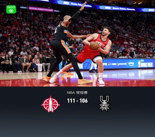 第一节火箭杜兰特拿下7分,马刺尚帕尼拿下15分,首节战罢火箭28-39落后马刺 第二节火箭申京拿下8分,马刺文班亚马拿下10分,半场结束火箭60-70落后马刺 第三节火箭申京拿下6分,马刺斯蒂芬-卡斯尔拿下8分,第三节结束火箭82-92落后马刺 第四节火箭里德-谢泼德拿下12分,马刺凯尔登-约翰逊拿下4分,最终火箭111-106战胜马刺