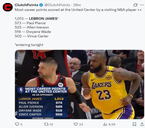 此役勒布朗也继续刷新历史首人纪录,在公牛球馆已经拿到1013分+是历史第一多。 |