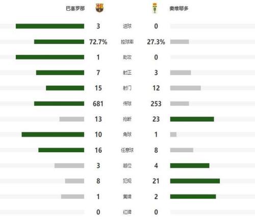 易边再战,巴萨在第52分钟打破场上平衡,前场抢断后,给了奥尔莫禁区内起脚的机会,后者低射打远角建功,帮助巴萨取得了1-0的领先,5分钟之后,皇家奥维耶多再次送出大礼包,后卫回传失误,直接给了拉菲尼亚单刀机会,巴西前锋笑纳大礼,帮助巴萨将优势扩大到了2球。