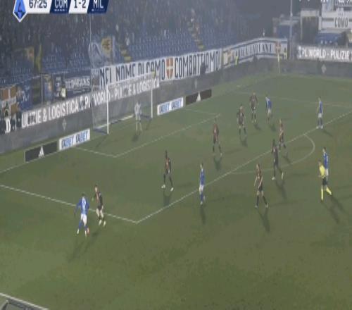 科莫一记斜传打向米兰的左路,靠着锋线两点压制米兰后卫,右后卫范德布雷普特拿球长驱直入畅通无阻并轻松起脚,莱奥换位在左路却没有起到相应的防守作用。直到第55分钟米兰2:1完成反超,阵型全面后撤收缩后,米兰10号才真正开始防守。 早早落后0:1,阿莱格里决定执行高位施压(赛后采访证实),只有恩昆库一人突前显然无法满足要求,于是中场整体都在向前压。