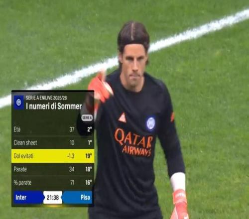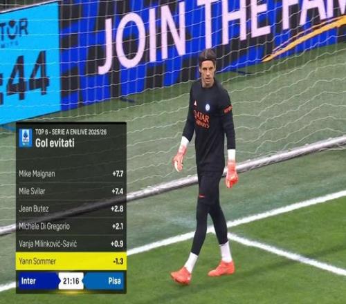 国米门将索默在这两个丢球当中都负有一定的责任,其中第一个丢球正是因为他的传球失误导致对手直接远距离吊射破门,第二个丢球也是他在角球当中被对手前点头球顶进了近角。 事实上赛前转播商DAZN还公布了一组本赛季意甲门将阻止对手预期进球的数据,其中米兰队长迈尼昂以7.7球高居榜首,罗马门将斯维拉尔则是7.4球位居第二。而索默在这项数据上却是尴尬的-1.3,这意味着他甚至还让对手进了更多的球。
