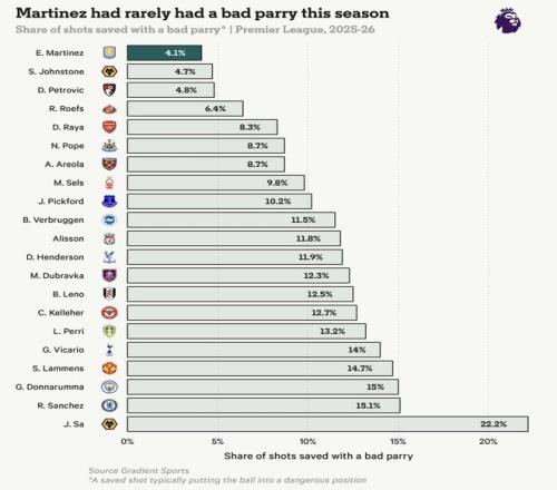 达米安-马丁内斯这个状态反复的赛季,其实是在上赛季最后一个主场比赛之后就已经开始了。 当他向维拉公园的球迷挥手告别时,眼中含着泪水,这一幕暗示着这次告别可能是永久性的。这位阿根廷国门在博迪穆尔希思训练基地告诉身边的人,他正受到一家欧洲豪门的关注,同时他也与当时的曼联主教练鲁本-阿莫林进行了会谈,后者非常希望将他带到老特拉福德。他的同胞利桑德罗-马丁内斯,甚至还与曼联高层沟通,试图说服俱乐部完成这笔签约。 只要能找到合适的替代者,阿斯顿维拉并不排斥达米安-马丁内斯离队。俱乐部在转会市场上进行了广泛考察,对霍安-加西亚、舍瓦利耶、弗莱肯、迪奥戈-科斯塔,以及曼联最终选择的拉门斯都有了深刻印象。 整个夏天暗流涌动的紧张气氛,在夏窗的转会截止日达到了顶点。那一天,达米安-马丁内斯坐在维拉的训练基地里,等待着来自曼联的电话,但这个电话始终没有响起。即便后来已经很明显,曼联转而追逐的是拉门斯,达米安-马丁内斯依然没有完全放弃希望。 值得肯定的是,维拉与达米安-马丁内斯最终修复了关系,双方计划在赛季结束后就他的长期未来展开进一步讨论。他仍然是埃梅里的头号门将选择。每当被具体问及这名门将的能力时,埃梅里总是毫不吝惜赞美之词,反复形容他“非常出色”,甚至就在去年9月还称他是“世界上最好的门将”。 在这个夏天之前,埃梅里的评价几乎无可争议。作为两届雅辛奖得主——该奖项授予世界最佳门将——达米安-马丁内斯长期以来确实表现出色;更关键的是,他极其稳定。他的表现配得上他张扬的自信和强烈的自我意识。维拉之所以能够容忍他强势的个性,是因为他始终在用表现回报球队。 然而,本赛季却出现了明显变化。用埃梅里的话来说,达米安-马丁内斯依然“非常出色”,但这种出色更多体现在零星瞬间和个别比赛中,而非长时间、持续性的高水平发挥。 这一点可以用一个数据直观体现:本赛季英超联赛中,没有任何球员比马丁内斯出现更多“直接导致丢球的失误”(3次)。 维拉主场0-1负于埃弗顿的比赛,正是达米安-马丁内斯本赛季表现的延续:在打出精彩甚至非凡的比赛、完成不可思议的扑救之后,往往紧接着就是受伤,或者一次关键性失误。这样的循环反复出现。 背部和小腿的伤病已经导致他三次在最后时刻无法出场——其中两次发生在赛前热身阶段,一次发生在中场休息时——这进一步加剧了外界的沮丧情绪。 达米安-马丁内斯在与埃弗顿的两场比赛中的表现反差,也折射出整个赛季的趋势。9月的客场比赛中,他曾神勇扑出迈克尔-基恩的头球,完成一次堪称史诗级的扑救;但在主场的这场较量中,他却与保-托雷斯一道,间接促成了巴里的制胜进球。 失误始于保-托雷斯一次沉重的停球,终结于达米安-马丁内斯未能稳稳接住一粒在湿滑草皮上滚动的皮球,他将球挡出,却正好弹到巴里的跑动线路上,后者轻松补射得分。 公平地说,这次失误在整体射门扑救层面上仍属个例。达米安-马丁内斯在这一领域依然处于顶级水准。借助足球分析公司 Gradient Sports 的数据,可以评估本赛季英超出场时间超过900分钟的门将中,“不理想扑救”所占的比例。 所谓“不理想扑救”,指的是门将虽然完成了扑救,但在处理方式上本可以做得更好,通常表现为将球挡入危险区域。 从相关数据图表可以看出,在埃弗顿来访之前,达米安-马丁内斯的不理想扑救比例是最低的,这意味着他的接球和处理能力总体上仍然稳健。当射门直奔他而来时,球通常都会被牢牢控制住——要么直接抱住,要么用强有力的手型将球击向安全区域。 不过,在其他方面,问题逐渐暴露出来,尤其是在防守对手定位球时,他在禁区内的威慑力明显下降,同时在主动出击和摘高空球方面也变得不够坚决。