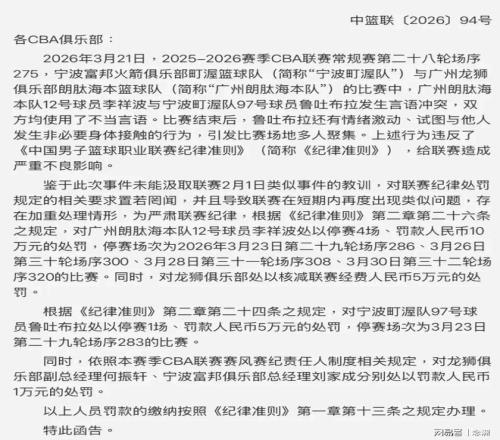 北京时间3月23日,CBA常规赛宁波对阵广州,李祥波涉嫌地域歧视、破坏民族团结,引起很大争议,CBA官方宣布了处罚结果:停赛5场,罚款10万元。