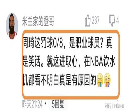 号称国内第一中锋的周琦,在罚球线灾难性的表现,也遭到网友们的纷纷吐槽。“八罚零中,这是你的职业啊,以前还能投三分,现在一点篮子都没有了,说白了就是缺练,每天训练后加练2000个罚球,怎么也不可能罚这么烂,固定的距离,没防守干扰,这么简单的分数,你一直丢,有羞耻心吗???”;“周琦 你这是职业球员? 我让我九岁的女儿,罚八个球她都不可能说一个不进,我一个老农民,单手也都不可能八罚不进,真的是悲哀!”。