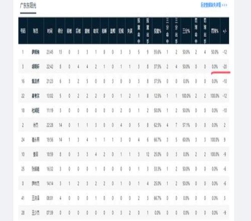 在第二阶段已结束的六场比赛中,胡明轩有两场正负值全队最低,分别是对阵上海时的-20、主场对阵新疆时的-7。