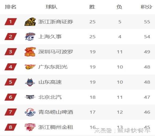 CBA积分榜最新排名出炉!广东被挤出前三:北京第6辽宁第9!