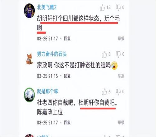 赛后广东球迷吵翻天,矛头直指杜锋和他的爱将胡明轩。他们说,“打个四川,第一节得13分,这5个首发真的是废,手忙脚乱完全不知道在干嘛”、“这几场杜峰给小胡首发就像五毒卡之前一直给医生”、“胡明轩打个四川都这样状态,玩个毛阿”,球迷呼吁:让胡明轩自裁走人。胡明轩已不单单是本场比赛表现拉胯,而是本赛季到目前为止都低迷,最近6场比赛均是得分个位数。尽管他表现糟糕,杜锋一直让他打首发,他真的是愧对了杜锋的厚爱。你们说呢?