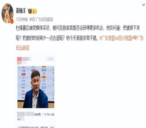 要知道,陈家政上场前,广东男篮的上半场打得那叫一个憋屈。首节13-14落后四川,半场也只以33-25微弱领先,主力们的进攻状态低迷,徐杰10投3中勉强拿分,麦考尔在场时进攻端更是一团乱麻。 直到杜锋把麦考尔摁在板凳席,换上萨姆纳,广东才在第三节找回节奏,单节打出30-7的攻势。但真正让比赛彻底失去悬念,还得是陈家政的末节暴走,他用一波流的得分,把广东的进攻火力推到了顶峰,也让自己从“冷板凳球员”一跃成为全场焦点。 这场爆发,陈家政直接打服了所有人。广东随队记者麦穗丰直言,甭管是不是末节垃圾时间刷分,能刷进就是本事,更何况这小伙子正处在有斗志的年纪,别凉了他的热血。 媒体人“别跑刚背猪”更是话里有话地调侃,直言这小伙子“没眼力劲”,一个后卫居然投出85%的命中率,13分钟拿20分,完全不按“常理出牌”。调侃的背后,是实打实的认可,毕竟在CBA赛场上,年轻球员能有这样的爆发力和效率,实在难得。