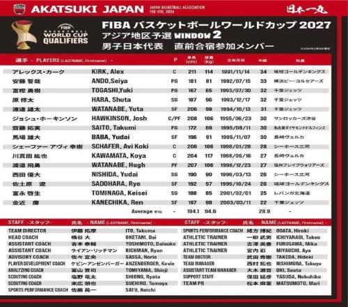 北京时间2月4日,在中国男篮公布21人集训名单后,如今日本男篮公布15人集训名单,由渡边雄太领衔,还有两位归化球员霍金森与阿莱克斯·柯克,而在公牛效力的河村勇辉不回归。