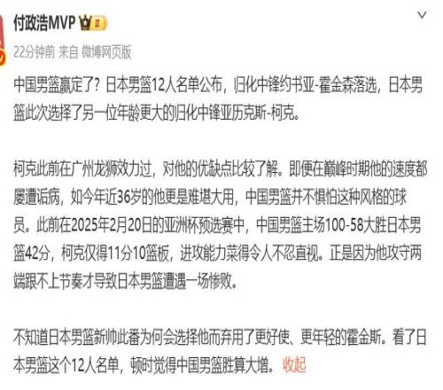 总体来说,日本队这一期的阵容要比之前弱,后卫线少了河村勇辉,锋线少了八村塁,内线更是少了霍金森,霍金森是这几年日本队的绝对内线中坚,这次他的落选对于中国队来说,无疑是件好消息,虽然顶替霍金森入选大名单的科克,身高也达到了211cm,擅长力量对抗,但相比之下,灵活性不足。 据媒体人付政浩的介绍:柯克此前在广州龙狮效力过,对他的优缺点比较了解。即便在巅峰时期他的速度都屡遭诟病,如今年近36岁的他更是难堪大用,中国男篮并不惧怕这种风格的球员。此前在2025年2月20日的亚洲杯预选赛中,中国男篮主场100-58大胜日本男篮42分,柯克仅得11分10篮板,进攻能力菜得令人不忍直视。正是因为他攻守两端跟不上节奏才导致日本男篮遭遇一场惨败。