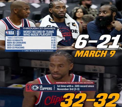 对于伦纳德,只要出勤够,这赛季最佳阵容应该稳稳的了,不过因为前期挖坑太大了,所以一阵应该没戏,大概率会是二阵或者三阵,34岁的他依然保持着联盟前十的硬实力,这一点毋庸置疑。 至于快船,同样因为前期挖坑太大,目前32胜32负只能排在西部第八,且距离西部第七的太阳(37胜27负)差了5个胜场、距离第六的掘金(39胜26负)差了6.5个胜场。