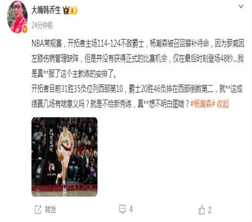 【开拓者124-114爵士】 今天,开拓者官宣召回杨瀚森 你以为——杨瀚森背靠背狂砍47分21板,微微一笑他已赢得主帅信任? 现实是—— 杨瀚森背靠背狂 砍47分21板, 紧急召回他又坐穿板凳 今天打个摆烂至上的爵士,开拓者差点没打明白 打了半节,被爵士打了28-15 斯普利特喊出暂停换下了克林根,你以为小杨要上场了? 不存在的! 不出所料,斯普利特又摆出了他最喜欢的五小阵容。 不过,你别说,你还真别说。 开拓者的五小阵容打个摆烂的爵士是真的好用啊 之后,他们轰出了一波20-0的冲击波,抹平了18分的分差,一举反超打停爵士,可谓是皆大欢喜。 毕竟,爵士这场球肯定是没想过赢的。 开拓者也是很佛系无所谓的,能赢就赢,输了也没关系。 开拓者目前西部第10,领先了第11的灰熊8个胜场差,基本不可能掉出季后赛附加赛,但想再往前靠一些又没那个实力,勇士、快船都不是易与之辈。 所以开拓者现在定位就很尴尬,打又打不过人家,摆烂也摆不过人家,就这样吊着一口气。 我们球迷的想法很朴素,既然开拓者没有KPI,斯普利特为何不大力起用培养锻炼杨瀚森,他可是首轮16号秀啊? 客观地说,实力不济。 别看杨瀚森在G联赛是通天代,梦幻脚步 、丝滑柔和手感、拉开空间的能力还是球场视野都是独一档。 一项统计,小杨G联赛场均16.4分、9.1个篮板、3.1个助攻、1.4个盖帽、投篮命中率57.1%,基本跟他CBA最后一个赛季持平 然而放在NBA级别,由于缺乏速度和力量,他的技术都无用武之地,甚至他的身体条件也成了劣 势 。 杨瀚森的定位不能是蹲底角投3分,内线卡位抢板吃饼的角色,他的优势在持球攻,但在开拓者,他没有这样的机会。 开拓者即便没有战绩压力,也不会让全队围着小杨转。 有美媒说,杨瀚森是 NBA下一个“比特币“的球员 这什么意思? 杨瀚森属于下限低又上限高的球员,风险极高。 所以,开拓者现在也很纠结。 放着16号新秀不给时间机会显得很蠢,但给足时间机会有可能更蠢。 在很蠢和有可能更蠢之间他们选择很蠢。 像今天,杨瀚森只在比赛最后时刻登场,在48秒的时间里各项数据都是0,正负值-3,上了又好像没上。 48秒也创下其NBA生涯单场最低出场时间纪录 尽管没有任何意义,但这在NBA其实很常见,并不存在恶心人的意思,毕竟强如詹姆斯的儿子布朗尼,也就这待遇。 但是吧,大嘴韩乔生气得破口大骂—— 韩老师到底不是专业的篮球主播,只是广大中国球迷的嘴替。 我想说:杨瀚森在NBA,是不可能给足球权的。 点击下方名片关注:贵圈真乱 |
