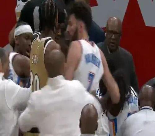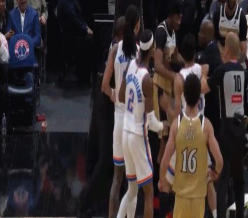 我去!兄弟们谁懂啊? 11连胜联盟第1的雷霆和15连败联盟倒数第2被热巴刷了83分的奇才,竟然打起来了? 是不是鸭梨刷太狠了,触动了奇才脆弱敏感受伤的神经? 和鸭梨无关,是无赖郑中基惹的祸。 半场结束前26秒,奇才一个普通的进攻得手。杰林威拿球底线发球。 也不知道杰林威想干嘛,拿着球就和站在底线的尚帕尼玩起了顶牛推搡,裁判见状迅速分开了两人。 此时,雷霆的米切尔赶紧上前助阵,尚帕尼眼瞅对方人多,抬手进行防御性进攻,一掌打了米切尔的脸。被当众打脸的米切尔如猛虎出匣,眼见就要扑倒尚帕尼,尚帕尼在裁判掩护下且战且退。