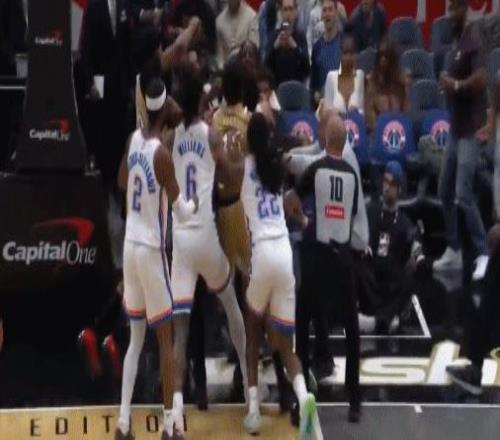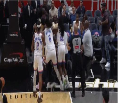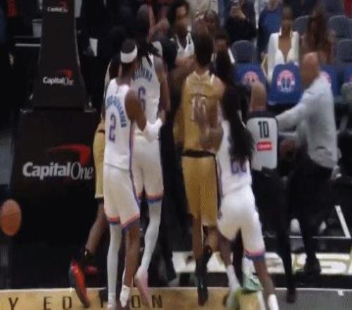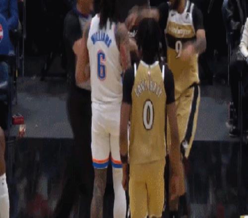场面瞬间变得混乱,两队N多人都纠缠到了一起,突然爆炸的多人大混战。 最惨的是吉尔,他本来只是想上来拉架的,没成想尚帕尼一掌早激怒了雷霆众将。 尚帕尼且战且退,吉尔就惨了,被雷霆众人 摁倒在地一顿输出。(身穿16号球衣的正是吉尔,真的惨) 雷霆:靓仔,学人做架樑啊嘛? 吉尔一脸懵逼:我就来劝个架,怎么成沙包了? (科普,其实“架两”是读“架樑”,在中国建筑中,樑是一种重要结构,用来支撑房屋的屋檐和屋顶,将重量导向两边的柱上。 所以形容替人出头或调解的行为,就叫做“架樑”喇~) 看看吉尔有多惨?几乎是一秒就被雷霆球员淹没了 更惨的是,裁判回放一看——吉尔全程没还手,纯纯被打的那个。所以最后被驱逐的名单里,没有吉尔…… 裁判经过漫长的回放,最终宣布:尚帕尼(技犯×2)、杰林·威廉姆斯(技犯×2)、米切尔、华莱士,四个人全部驱逐出场。 雷霆3打1,3人全部被驱逐。 雷霆一口气少了仨人,杰林、米切尔、华莱士手拉手一起回更衣室洗澡去了。这波操作属实是“有福同享,有架同打,有澡同洗”。 兄弟们,千万别打架,打赢了坐牢,打输了住院。 当然,最重要的是,千万别劝架,劝赢劝输都被打。。。。
