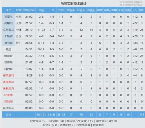 杜兰特出战39分32秒,投篮22中15,三分9中5,罚球8中5,得到40分7篮板5助攻4失误,正负值-18全场最低。申京19投16中,得到33分13篮板10助攻2抢断2盖帽,正负值-6。杜兰特、申京、阿门合计54中39得到96分,其余队友38中10仅得28分。