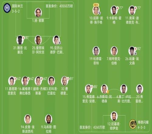 贵为上赛季欧冠亚军,国米无疑是纸面阵容上更强的一方,但首回合却踢了个1-3,齐沃本场派上皮奥-埃斯波西托和马库斯-图拉姆搭档双前锋。 然而次回合回到主场,蓝黑军团进攻效率依旧不佳,反倒是博德闪耀延续出色表现,海于格、卡斯帕-霍和布隆贝格组成进攻三叉戟。