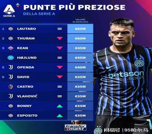 在最新一期意甲全队身价排行榜上,总身价达7.43亿欧元的国米坐稳了头把交椅,其中个人身价达到8500万欧的劳塔罗贡献值最大,虽然暂时丢掉了亿元先生的头衔(巅峰时的自己1.1亿欧元),一直在全力以赴地倾注热情。 在数据上,他为国米本赛季各项赛事亮相了39场,交出了20粒进球和4次助攻的成绩单,领跑意甲射手榜之余,国际米兰顺势在积分榜上当上了领头羊,本赛季似乎有收拾旧山河的趋势。显然,彼此双向奔赴持续进行时,用齐沃的话说:“我们不会怀疑劳塔罗的重要性。”