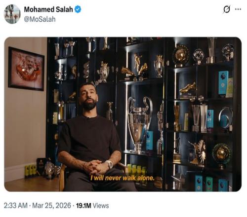 当地时间3月24日,英超利物浦队球星穆罕默德·萨拉赫在社交媒体平台发布告别视频,宣布将于本赛季结束后离队,结束9年利物浦生涯。